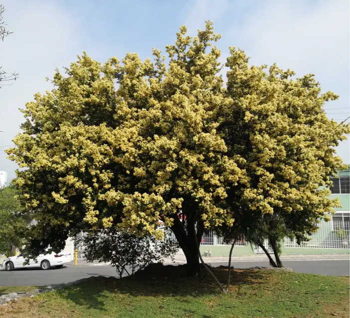 • Árbol de tamaño medio, alcanzando una altura de 12 metros. Su velocidad de crecimiento es moderada. Su follaje es de color verde vibrante, perenne y proyecta una sombra muy densa todo el año. En primavera presenta una floración espectacular con miles de flores fragantes de color crema. Sus ramas son rígidas, las cuales le dan un efecto de árbol escultórico con alto potencial paisajístico. En banqueta, requiere un arriate con ancho de al menos 1.5 metros. Nota: hay que considerar que las pequeñas hojas que se renuevan y caen pueden crear mucho residuo sobre la calle y los carros que se estacionen debajo de él (son excelentes para acolchado y composta por su diminuto tamaño que se degrada rápidamente).