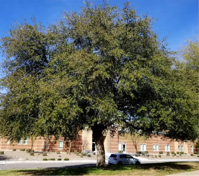 • Alcanza una altura de 12-15 metros, pero puede alcanzar hasta 30 metros de diámetro por el crecimiento horizontal de sus ramas, lo que lo hace un árbol recomendable para dar sombra en áreas extensas. Es necesario hacerle una poda de formación en su juventud para evitar un crecimiento horizontal excesivo. Hay que considerar que requiere un arriate de por lo menos 2 metros de ancho para no tener problemas en el futuro. Su velocidad de crecimiento es moderada y su follaje es perenne. Este árbol hibrida con facilidad con el encino bravo (Q. fusiformis), por lo que es común encontrar mezclas entre estos dos, las cuales son más resistentes a heladas y sequías.