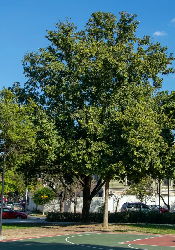• Árbol que alcanza 15 metros de alto. Produce las nueces comestibles que conocemos como nuez pecana. Su velocidad de crecimiento es moderada, pero se puede acelerar si el suelo donde se plante no está muy compactado y se riega constantemente. De follaje caduco, perdiendo todas sus hojas en invierno, lo que lo vuelve ideal para mitigar las temperaturas del verano y dejar pasar la luz del sol y el calor en invierno. Ideal para plantar en banquetas con arriates de 2 metros de ancho mínimo, o en jardines, donde la caída de sus hojas en otoño no se convierta en un problema, como el bloqueo de los drenajes. Te recomiendo que no las desperdicies y las uses como acolchado en tu jardín (o macetas) o para tu composta.